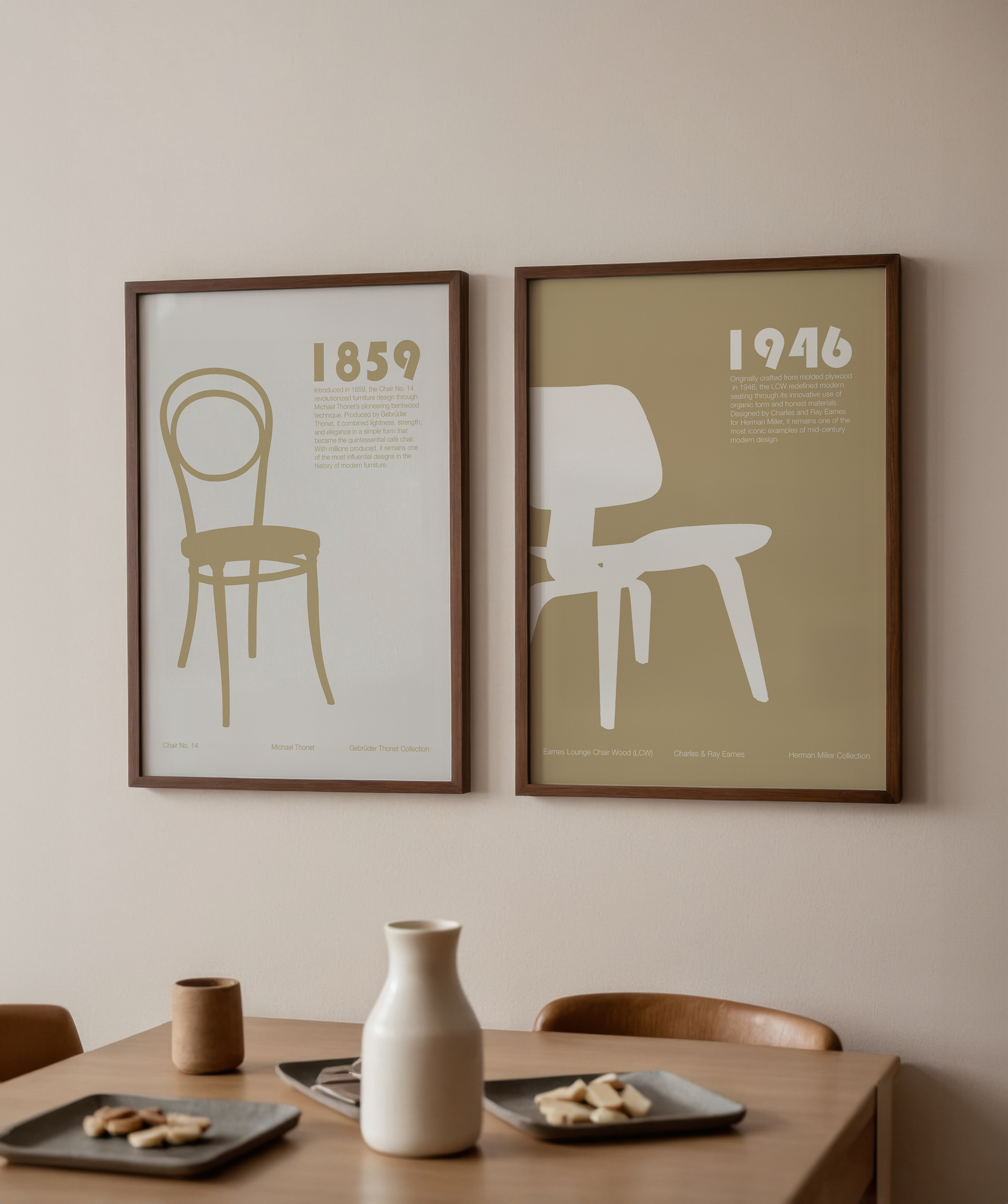 This poster celebrates one of the most influential furniture designs of all time. Chair No. 14, created by Michael Thonet in 1859, reshaped modern furniture through its elegant form and innovative bentwood construction. The iconic silhouette captures the lightness, strength, and simplicity that made the chair a defining symbol of café culture and timeless design.