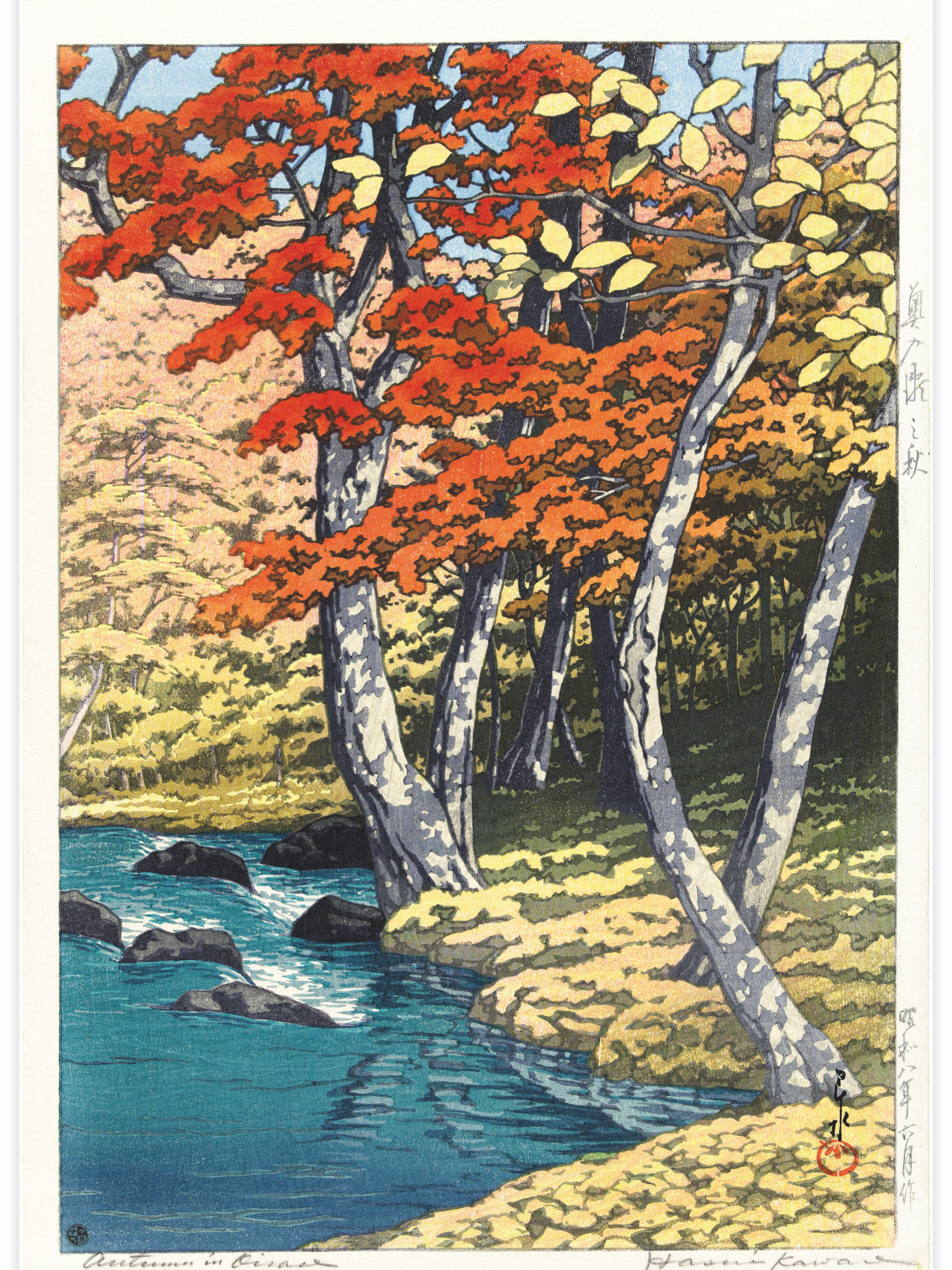 A celebration of autumn’s brilliance, this poster by Hasui Kawase captures a riverside scene rich with orange, gold, and green foliage. The reflections in the calm water and the play of light through the trees convey both vitality and harmony. It’s an image that feels alive yet meditative, showcasing the beauty of Japan’s seasonal landscapes.
