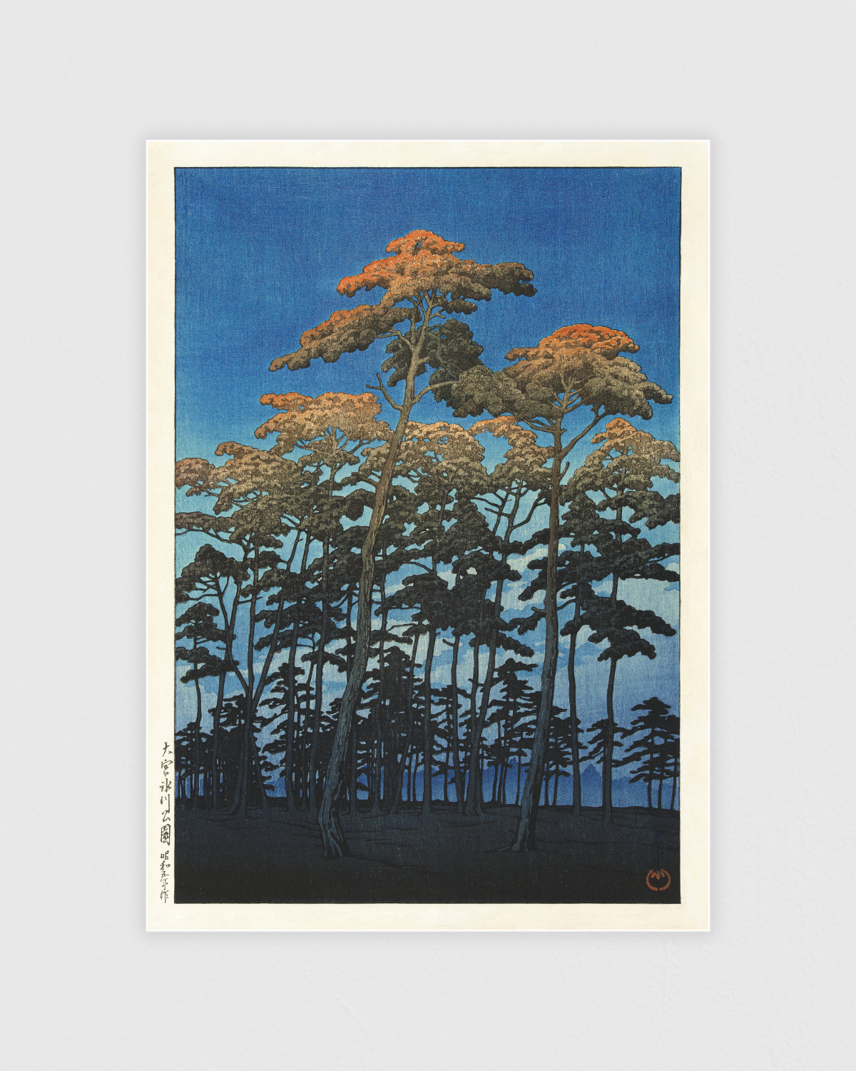 Bathed in the soft light of a late afternoon, this poster by Hasui Kawase captures the tranquil atmosphere of Hikawa Park in Omiya. The towering trees glow in deep shades of amber and blue, their reflections mirrored in the quiet water below. Every stroke and gradient reveals Kawase’s mastery of translating fleeting light into timeless serenity.