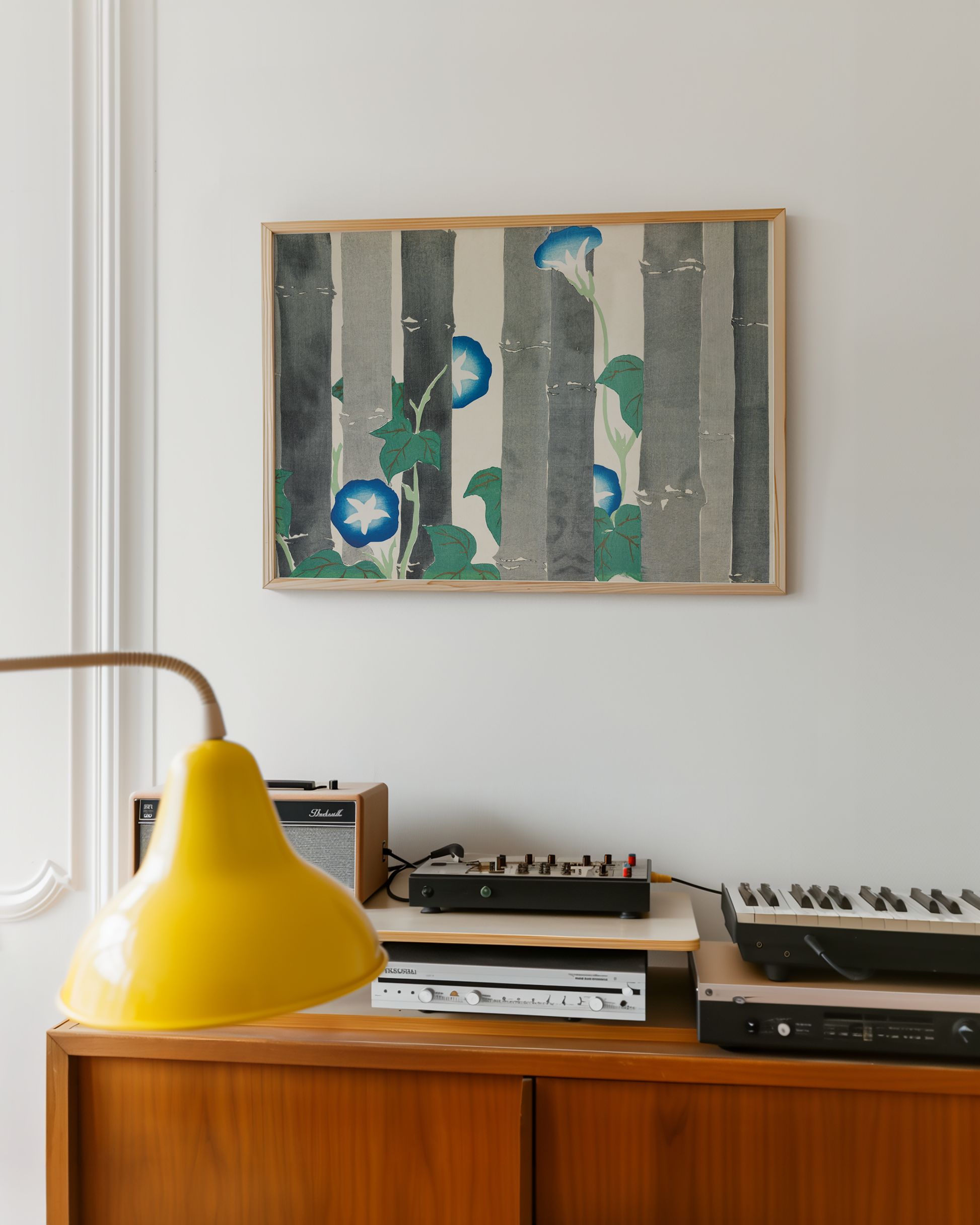 Soft green leaves intertwine with violet blossoms in this graceful poster from Kamisaka Sekka’s Momoyogusa series. The morning glory, a symbol of fleeting beauty, is rendered with an elegance that feels both natural and stylized, revealing Sekka’s unique vision of nature as art.