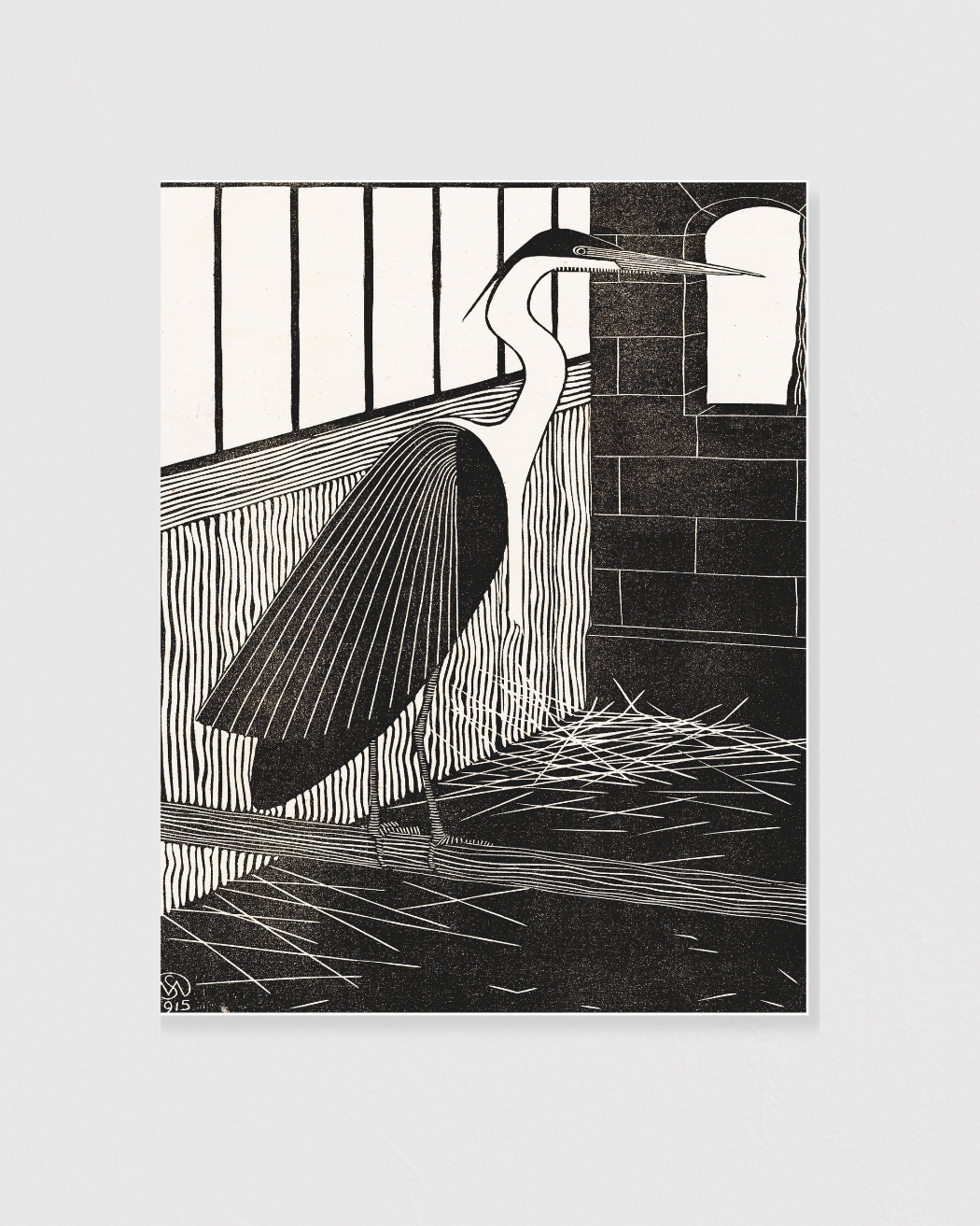 This captivating woodcut print presents a great heron in striking black-and-white contrast, its poised stance enhanced by precise linework and bold geometric patterns. De Mesquita’s unique artistic style transforms the bird’s graceful form into a mesmerizing composition, rich in texture and rhythm.