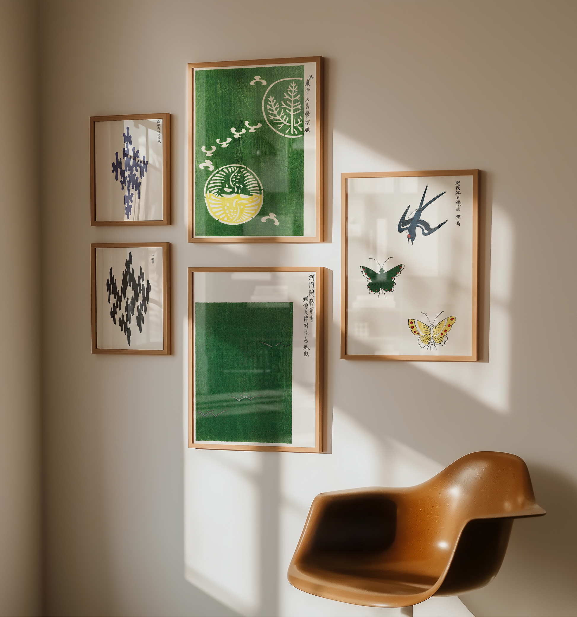 Together, these five works create a harmonious gallery wall that brings the essence of Japanese artistry into any interior. Perfect for living rooms, creative spaces, or offices, this poster set offers a timeless blend of elegance and cultural depth.