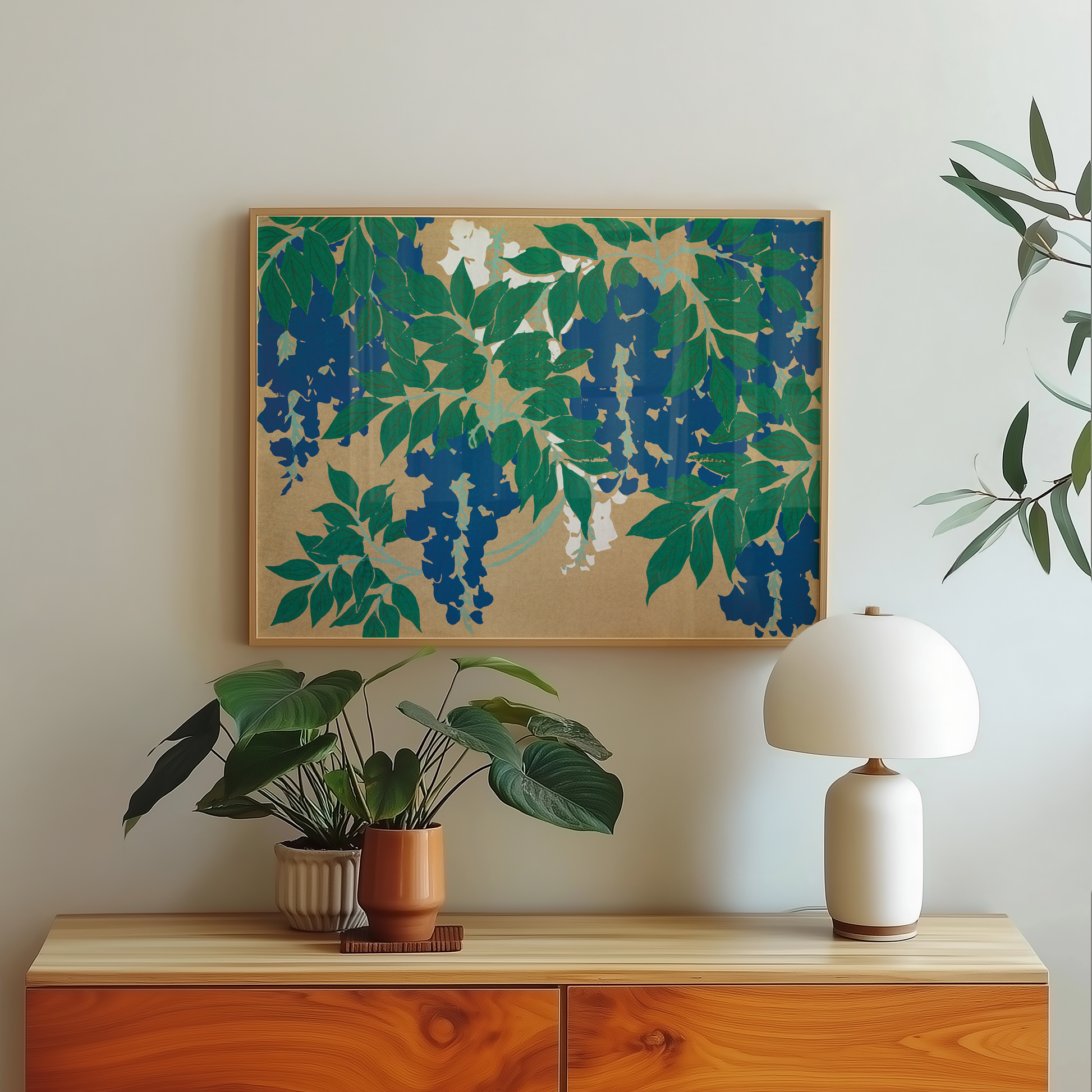 In this delicate poster, Kamisaka Sekka captures the cascading beauty of blooming wisteria. The soft lilac tones and flowing composition embody the harmony between nature and design that defines Japanese art. Each petal appears to sway gently in the breeze, balanced between precision and dreamlike movement.