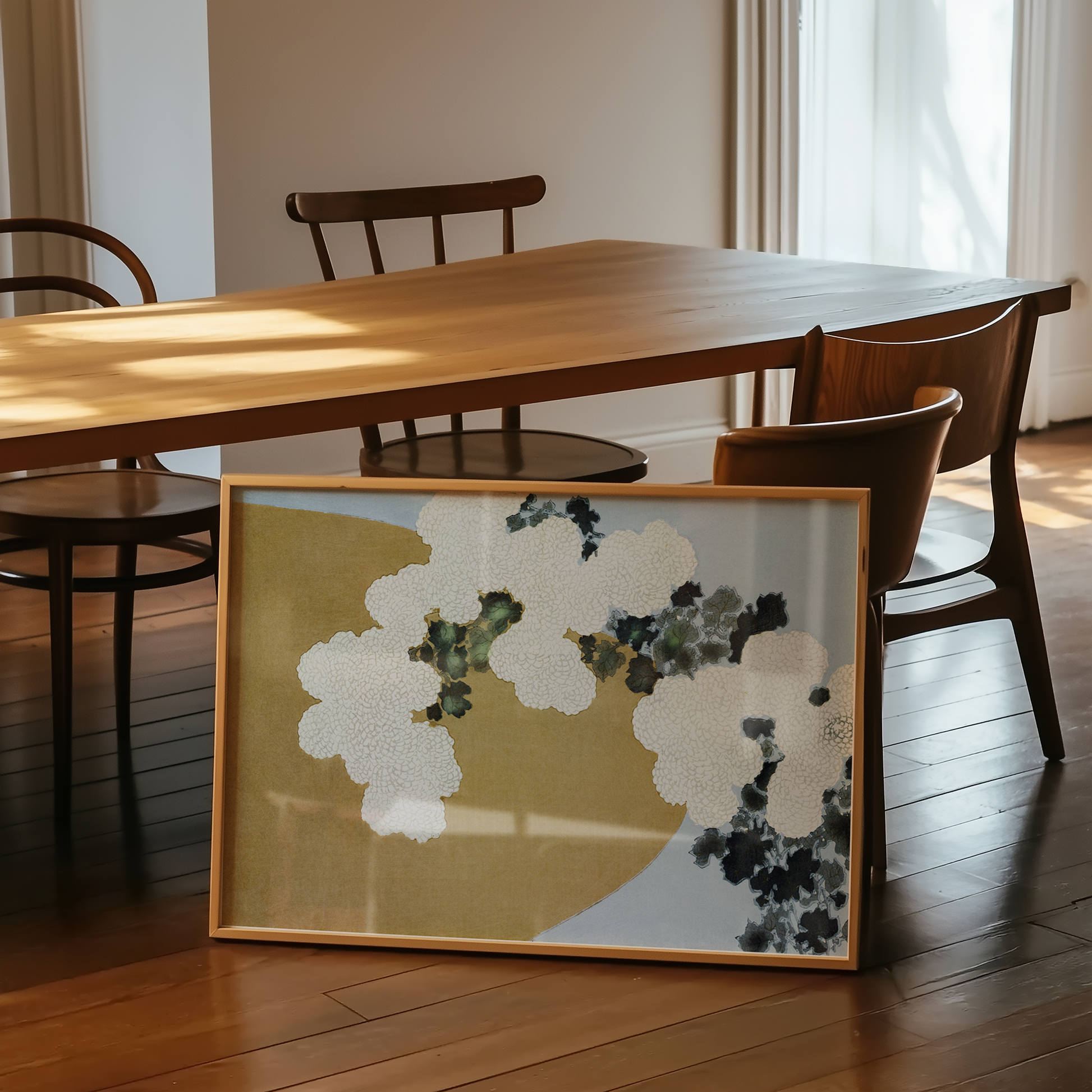 Denna poster , som är en del av konstnärens hyllade Momoyogusa -serie, blandar minimalism med lyrisk charm. Den ger en lugn och dekorativ känsla till alla utrymmen, perfekt för dem som uppskattar konst som känns både elegant och tidlös.