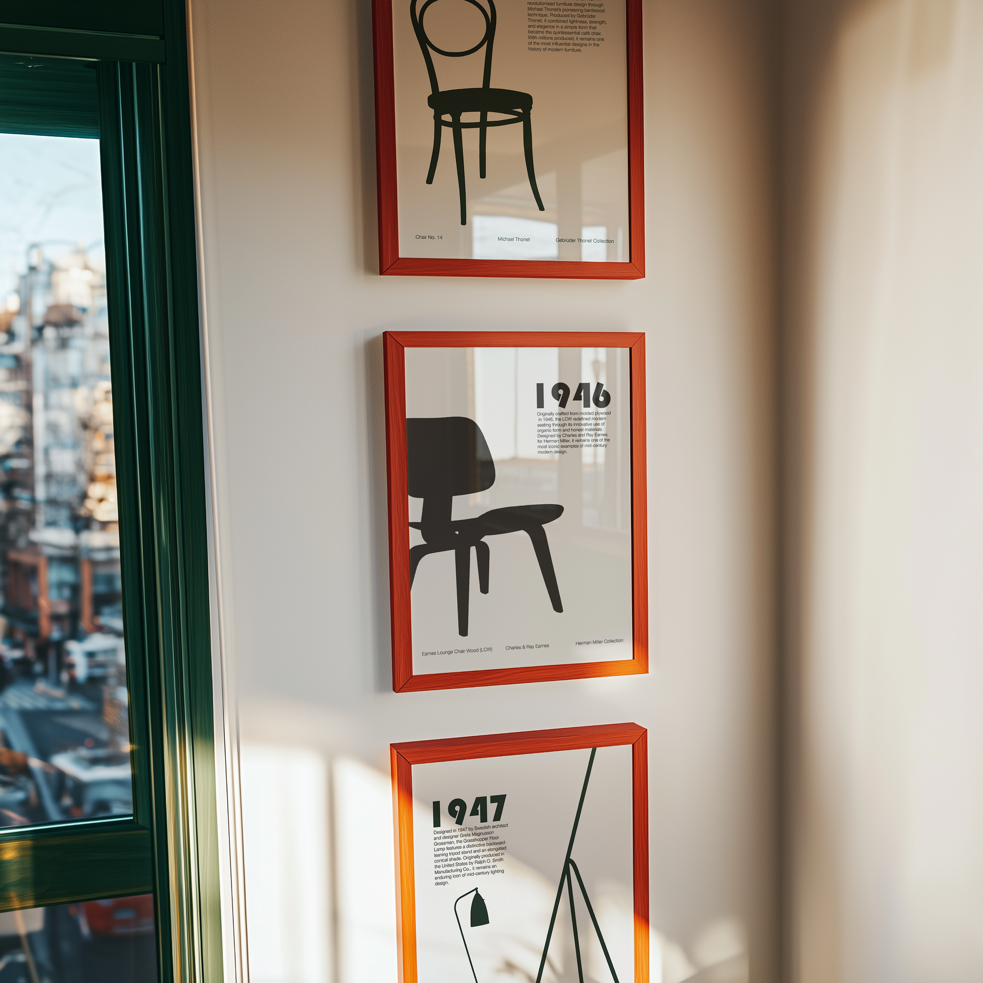 Eames Lounge Chair Wood (LCW)-postern hyllar en av 1900-talets mest ikoniska designer. LCW introducerades första gången 1946 och omdefinierade moderna sittmöbler med sin skulpturala användning av formgjuten plywood och sin betoning på organisk form, komfort och ärliga material. Silhuetten fångar den elegans och innovation som Charles och Ray Eames bidrog med i sitt samarbete med Herman Miller.