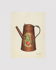 En charmig illustration i vintagestil av en handmålad kaffekanna i klassisk toledo-tradition. Denna poster framhäver både form och funktion och fångar den varma, dekorativa estetiken som är typisk för 1800-talets köksredskap.